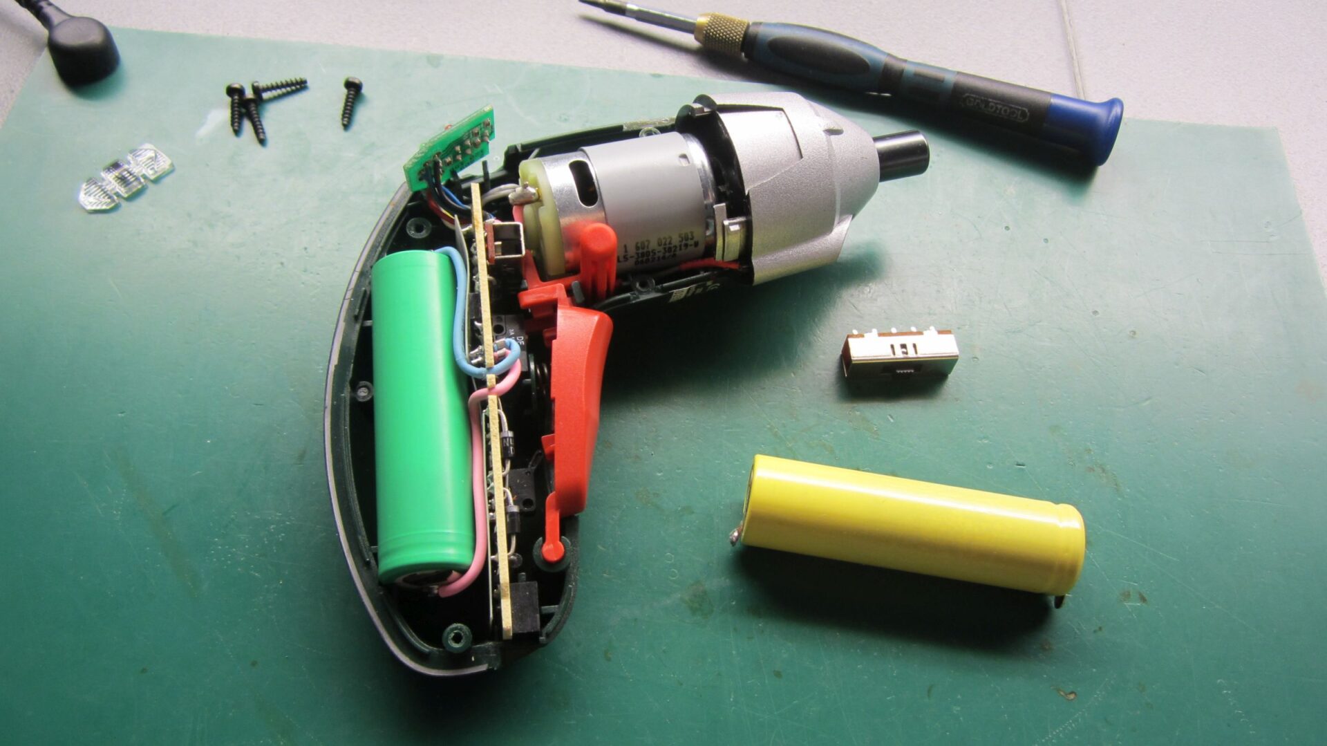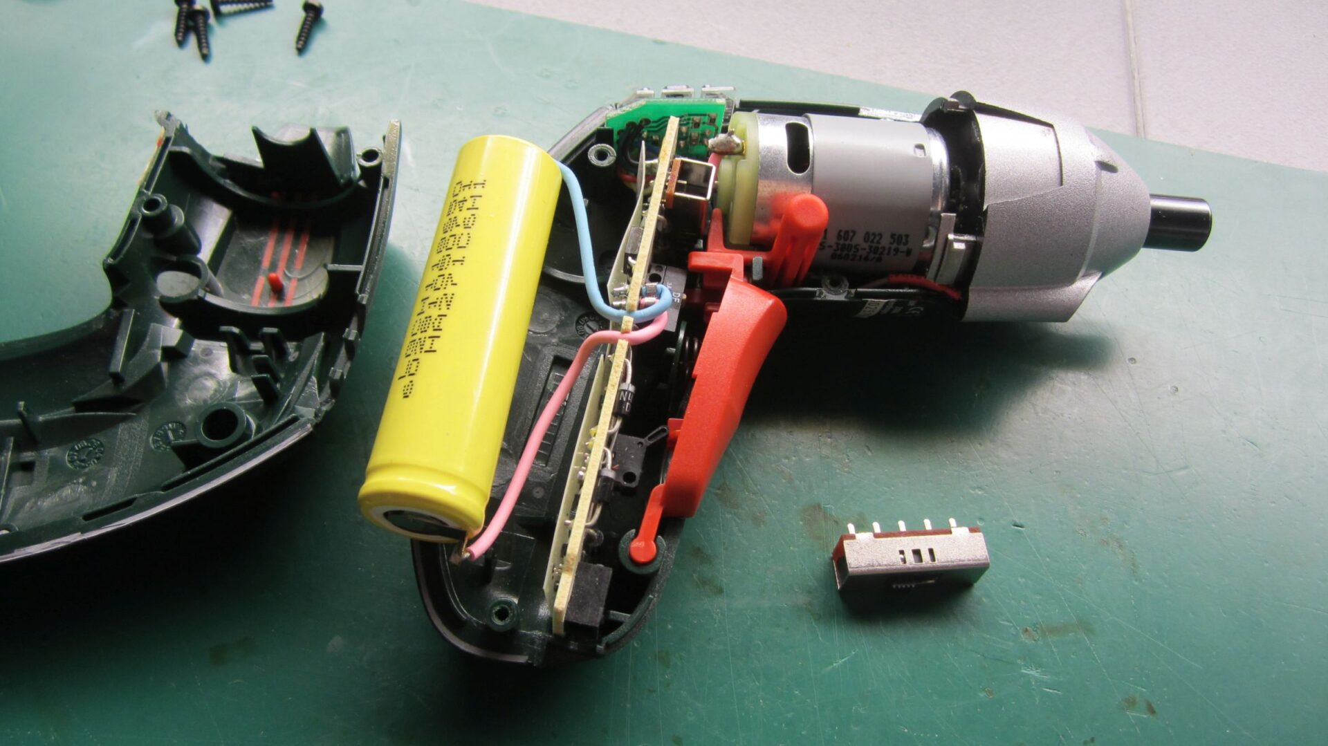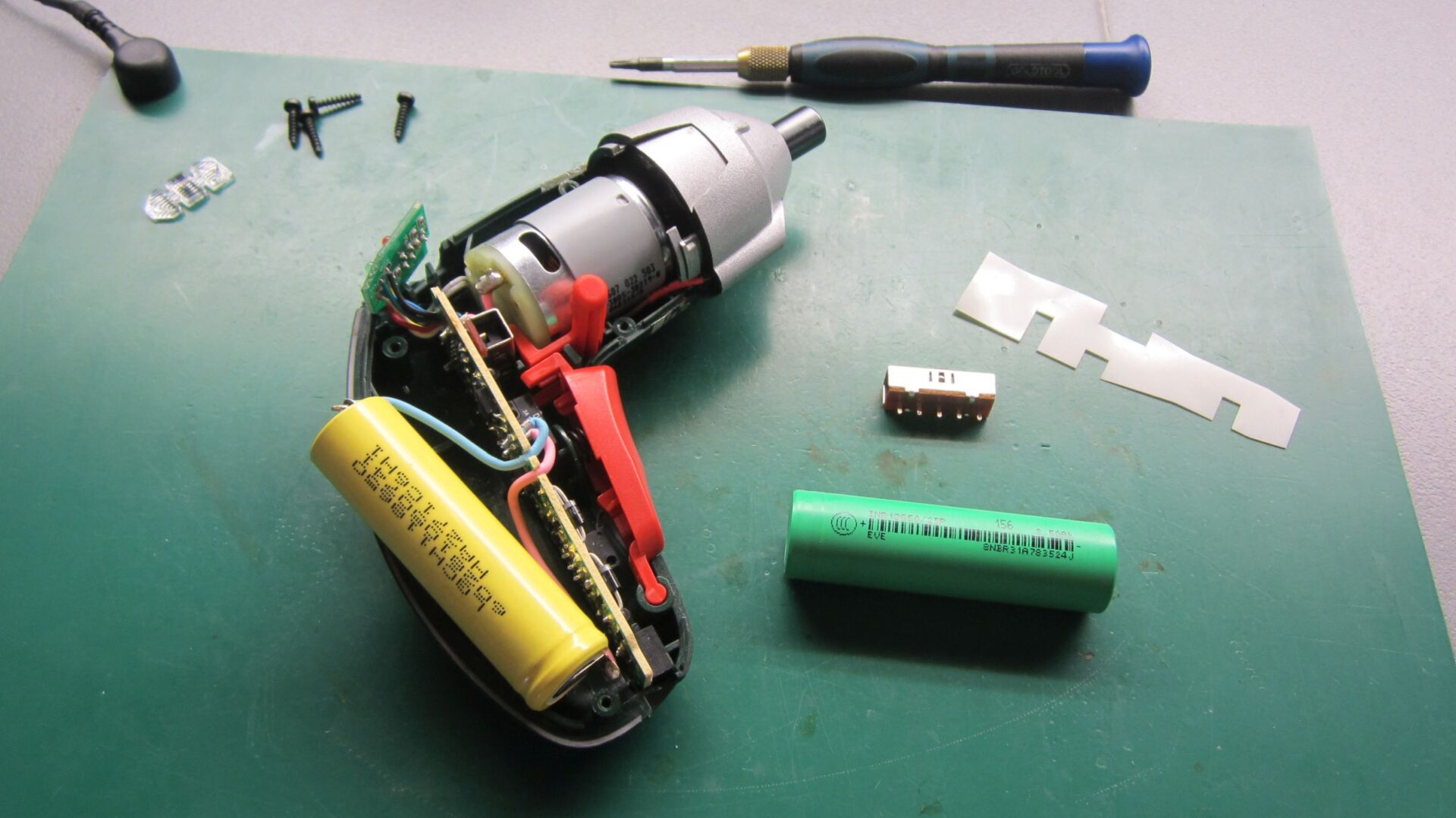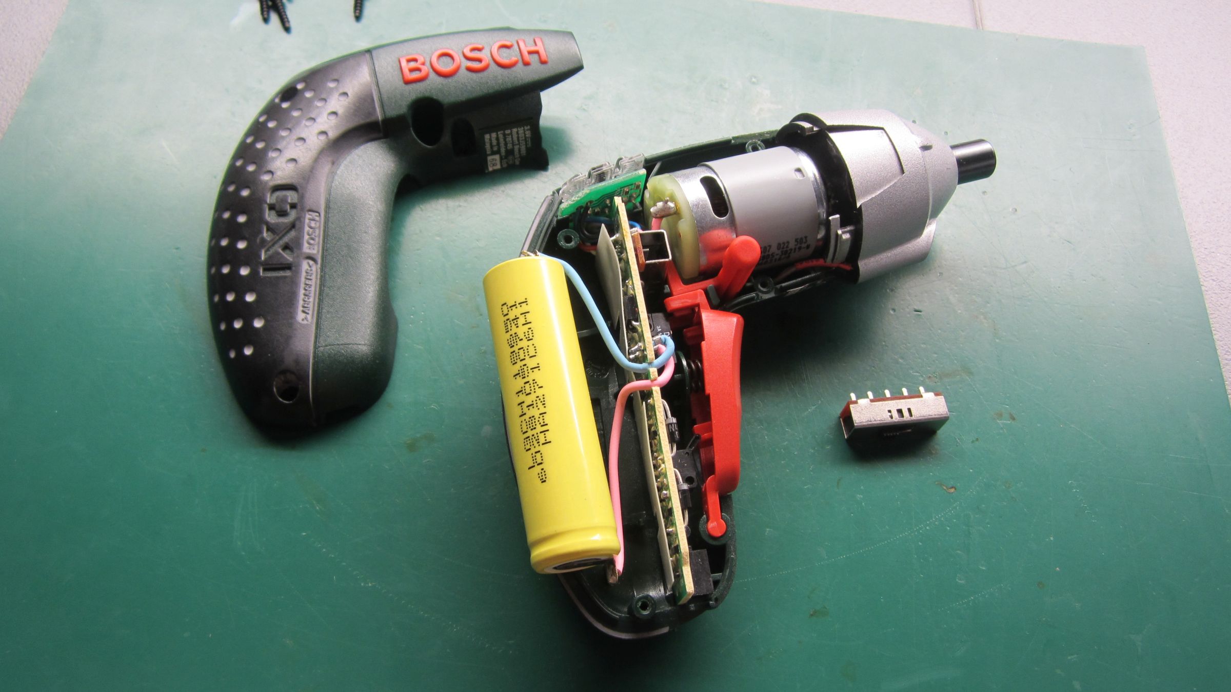 Το παρακάτω ηλεκτρικό κατσαβίδι Bosch IXO είχε βλάβη στο διακόπτη σκανδάλη (D2FC-F-7N) ο οποιος είχε κολλήσει σε θέση ON. Για την επισκευή εγινε αντικατάσταση του με καινούριο διακόπτη. Για το συγκεκριμένο εργαλείο έγινε και αλλαγή της μπαταρίας Λιθίου 18650 με καινούρια μεγαλύτερης χωρητικότητας.